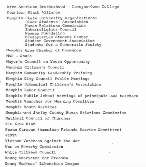 In 1965, the Memphis police department set up a domestic intelligence unit and shortly after began dispatching undercover police to “silent peace vigils” that anti-Vietnam War activists were holding at the city’s federal building. When city garbage workers began planning to organize with the American Federation of State, County, and Municipal Employees labor union in 1968, theMemphis mayor intervened by sending undercovers to collect intelligence on their activities.